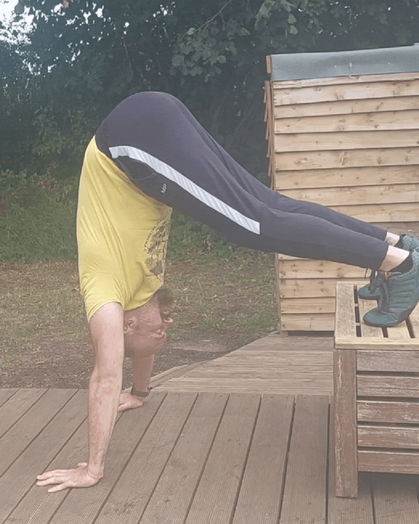 If this isn’t enough and you want more find something higher for your feet or you can either get some blocks or handles to get you head below your hand or you can kick up against a wall and do the handstand push ups.